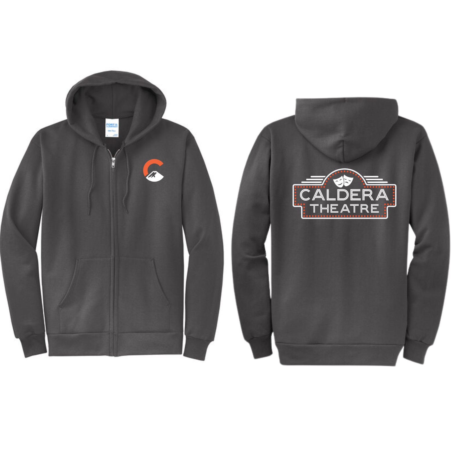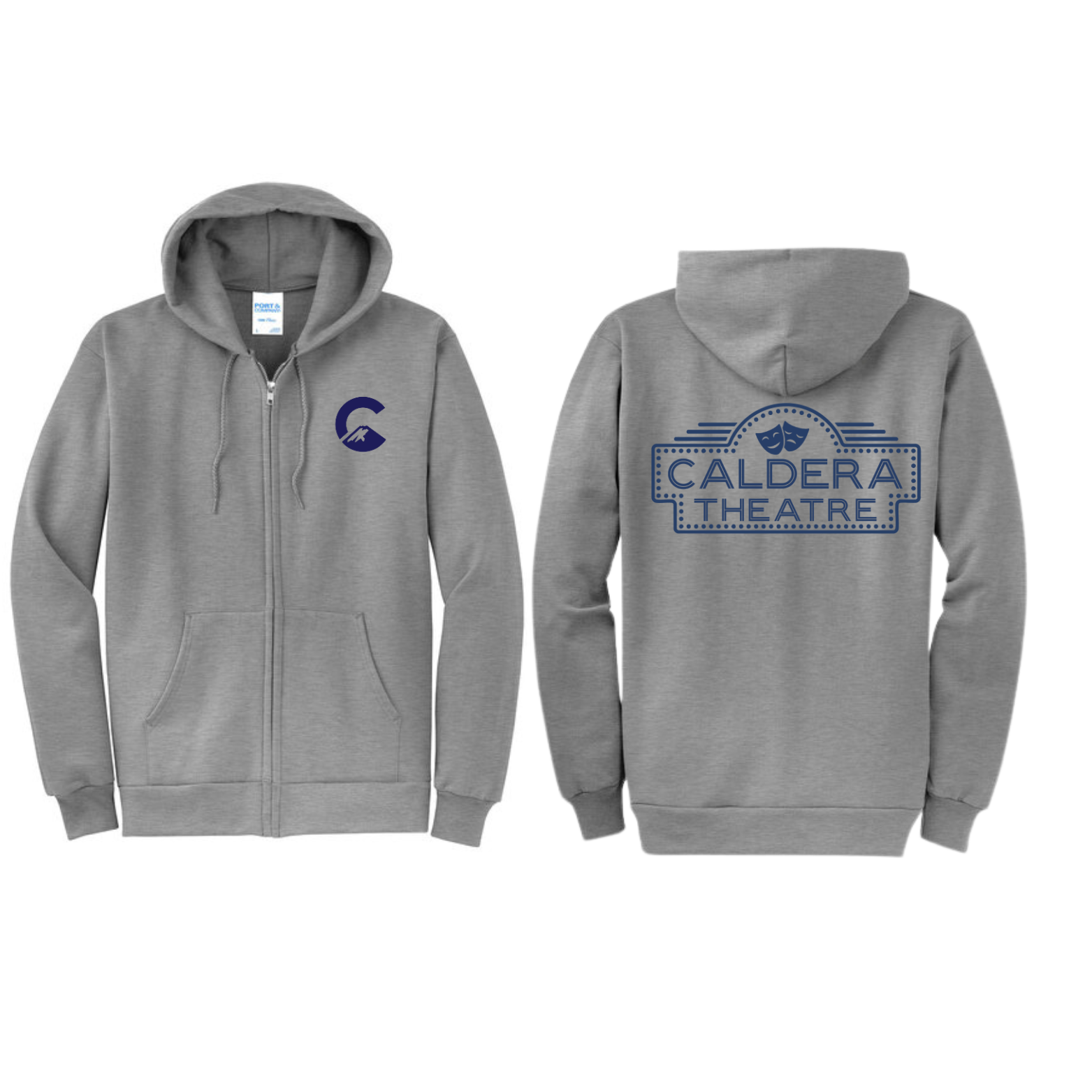 Snag some Caldera Theatre gear and rep the stage in style! Choose from hoodies, t-shirts, crewneck or zip-ups in black, navy, or light heather gray. Each piece features the Caldera Theatre logo on the front. You will also have the option to personalize the back for a few extra bucks! EXAMPLES-Students and parents you can add your last name, or go with something fun like “Theatre Mom,” “Drama Dad,” or anything that shows your theatre pride. Perfect for cast, crew, and supportive families!