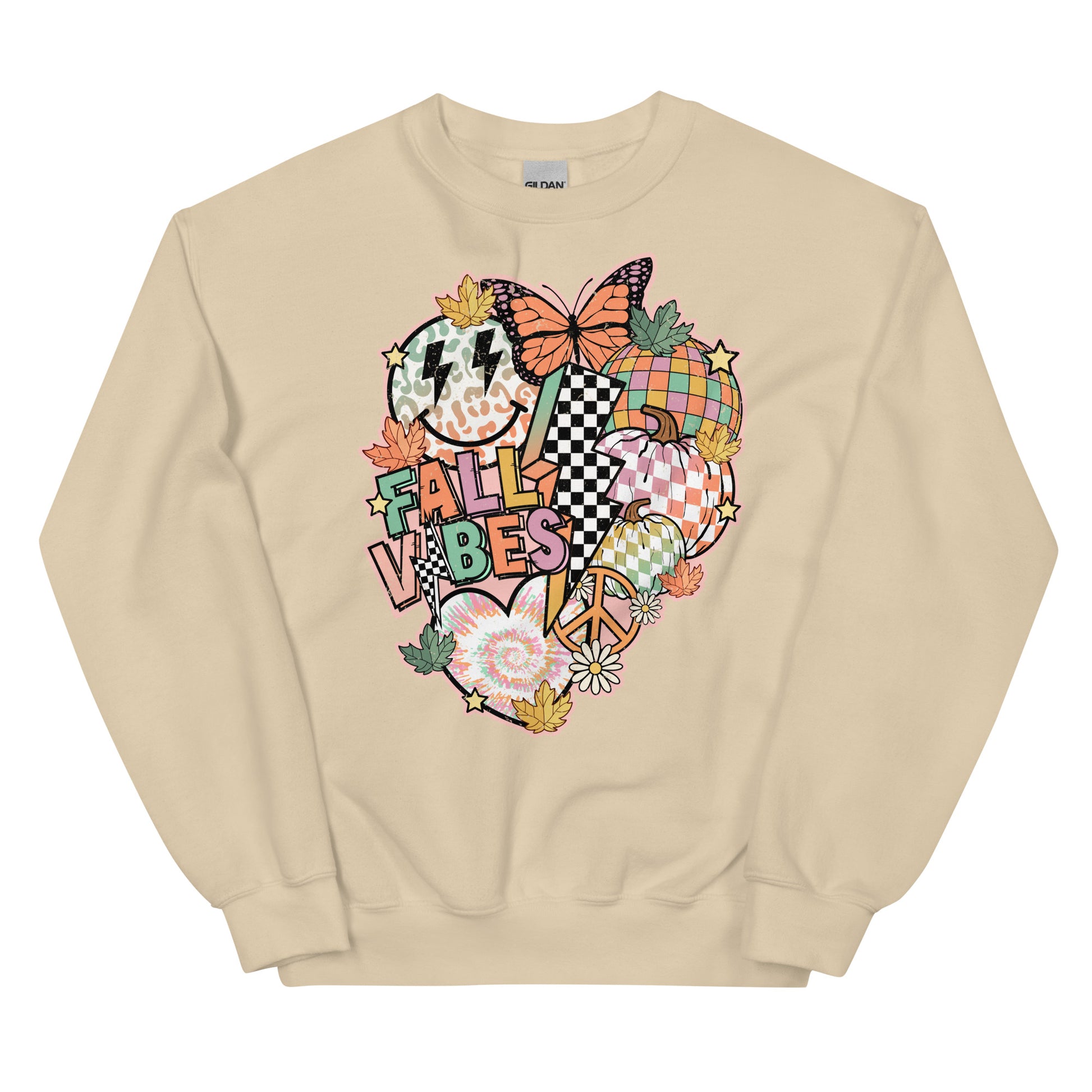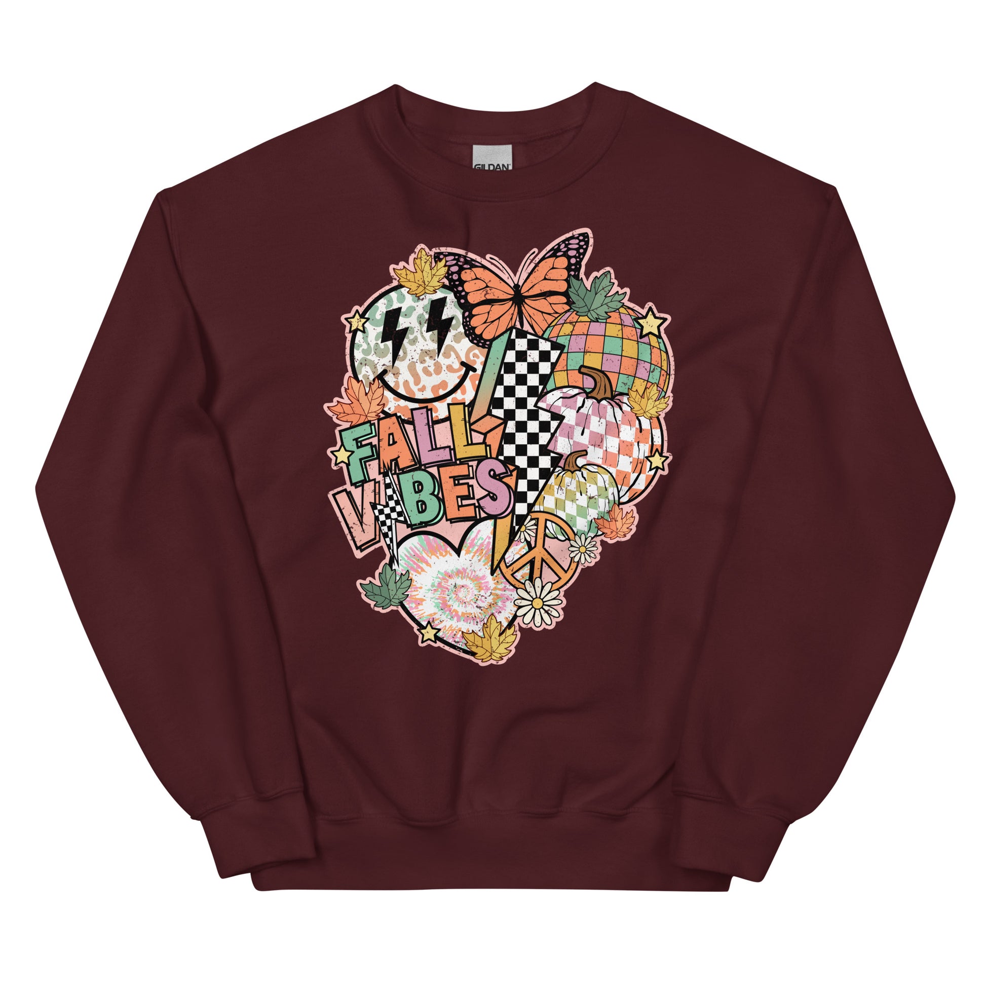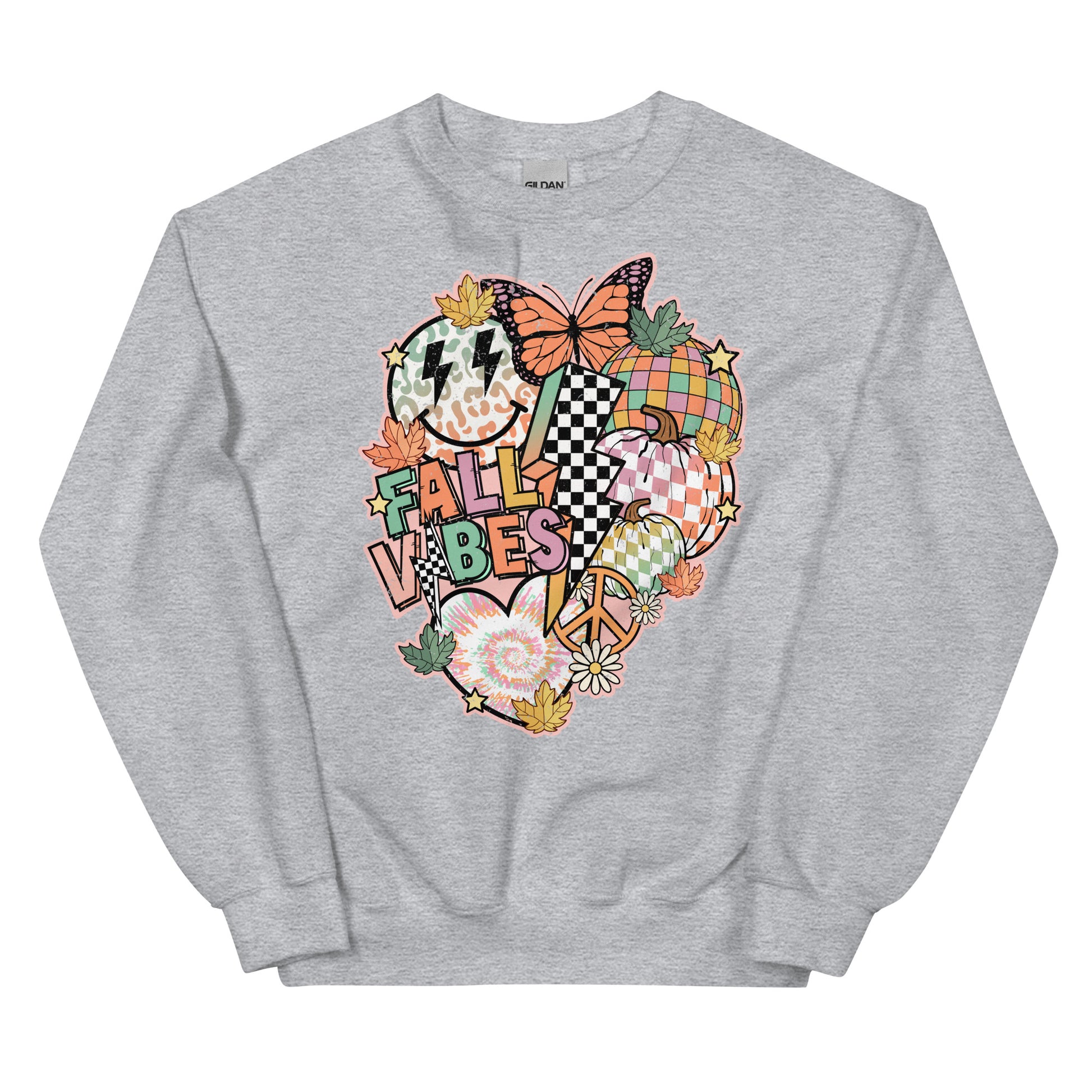 Feel the fall vibes with this cozy crewneck sweatshirt! Featuring a colorful collage of butterflies, electric bolt, smiley face, hearts, peace sign and more, this fun and festive top is sure to brighten up any fall look. Strike a pose and share your positive vibes!